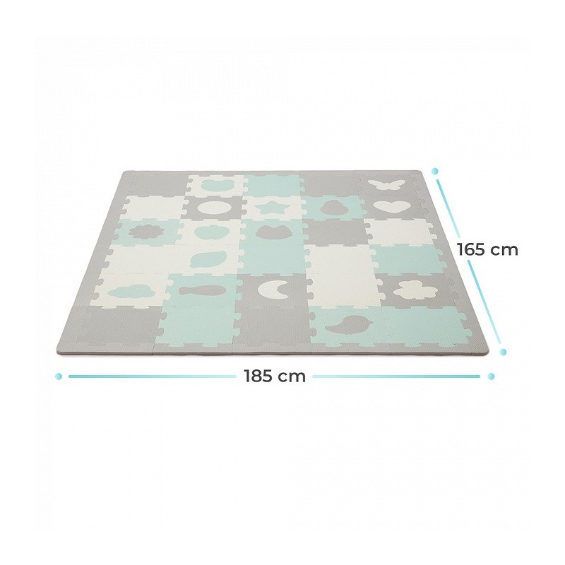 LUNO contiene 30 piezas con una superficie total de 150 x 180 cm, lo que permite adaptarse a cualquier espacio e incluso sustituir la alfombra de la casa por piezas de puzzle. Gracias a los colores utilizados, puedes estar seguro de que la estera se integrará perfectamente con el diseño de tu casa.