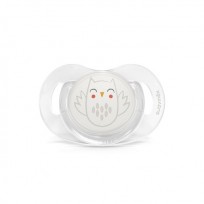 - Chupete con tetina fisiológica de silicona de 0 a 6 meses. La tetina dispone de una forma plana y simétrica que al colocarse evita que ejerza presión sobre el paladar.