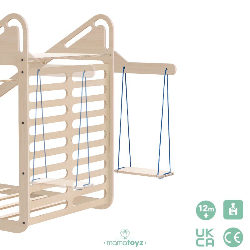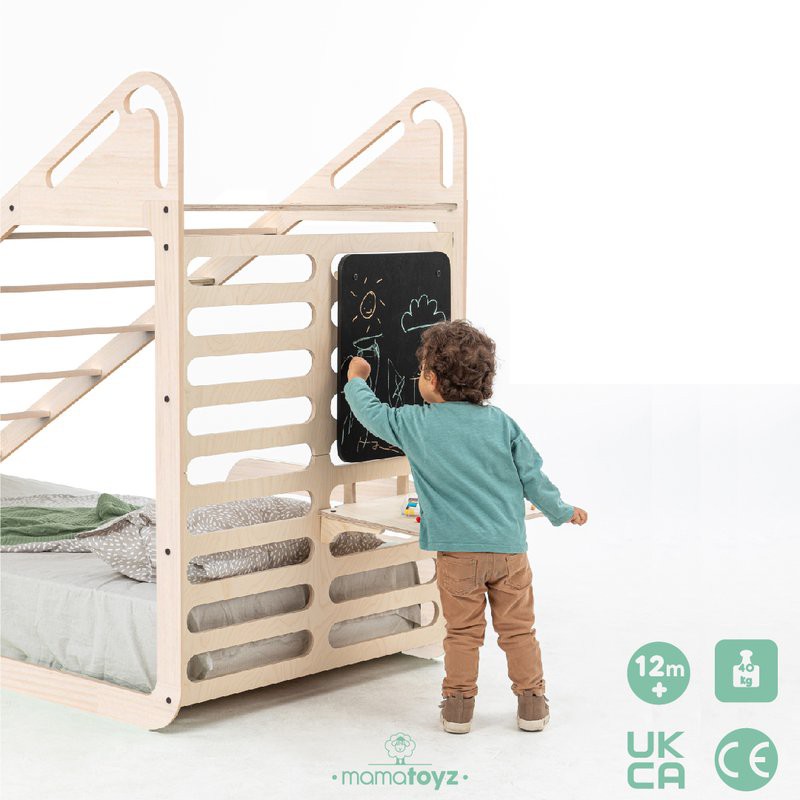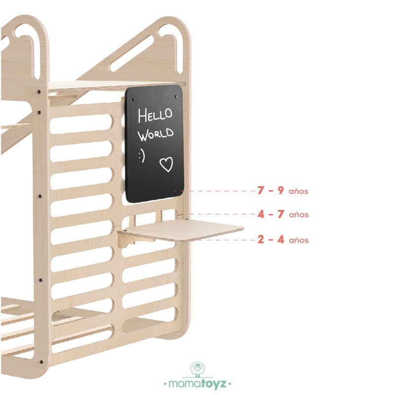 Transforma el espacio de juego y descanso de tus pequeños con el Sleepy accesorio escritorio+pizarra+columpio camita Montessori.