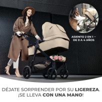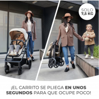 Su asiento convertible permite transformar la capota en silla de paseo. Además, cuenta con ruedas amortiguadoras y antipinchazos lo que resultará más cómodo a la hora de transitar por calles en mal estado o caminos de tierra.