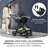 La silla adjunta se engancha fácilmente en el chasis del carrito gracias a los adaptadores universales. ¿El peque se ha quedado dormido en el coche pero tenéis que salir? No pasa nada, la silla se monta en el carrito en cero coma.