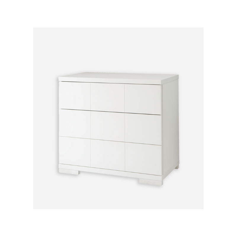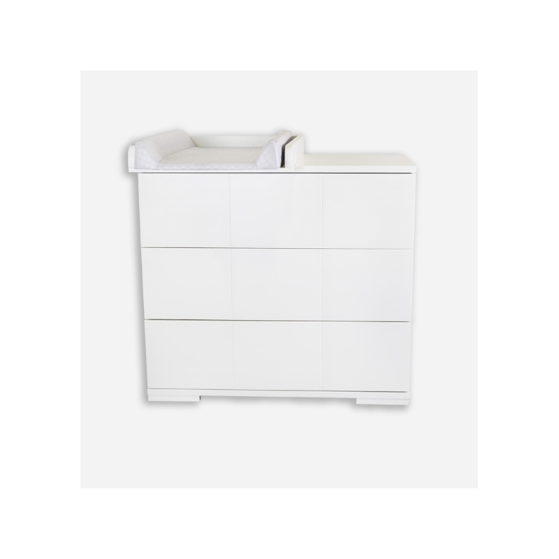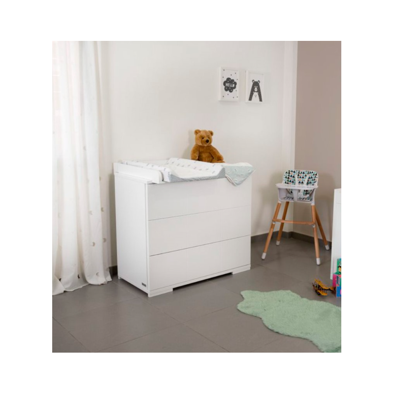 Ikid ha fabricado esta cómoda para bebé de estilo nórdico de la Colección Sicilia, la cual incluye 3 cajones espaciosos para almacenar, tiradores y la madera cambiador.