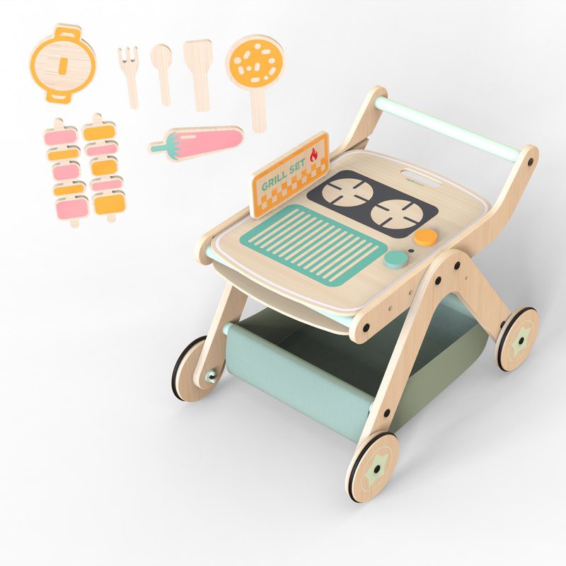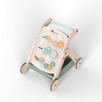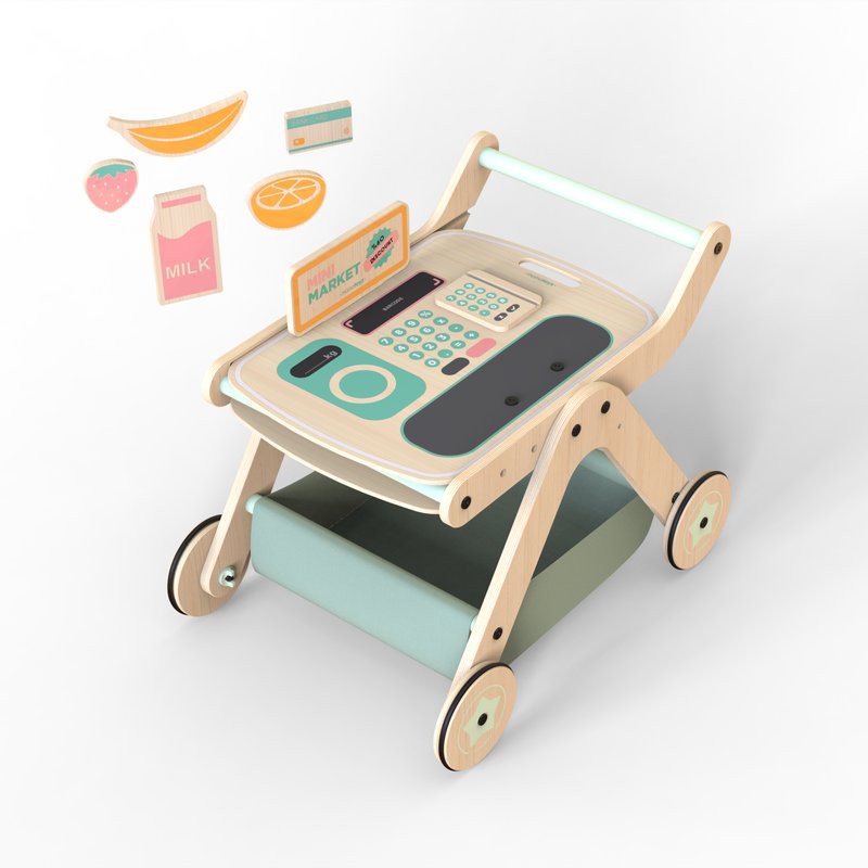 Disponible en dos versiones: mesa de actividades, andador, supermercado y carrito de la compra o mesa de actividades, andador, plano de ciudad y carrito de la compra.
