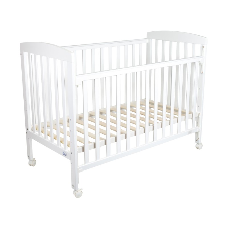 Incluye somier regulable en altura, barandilla abatible y ruedas con freno.