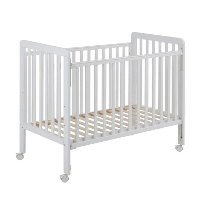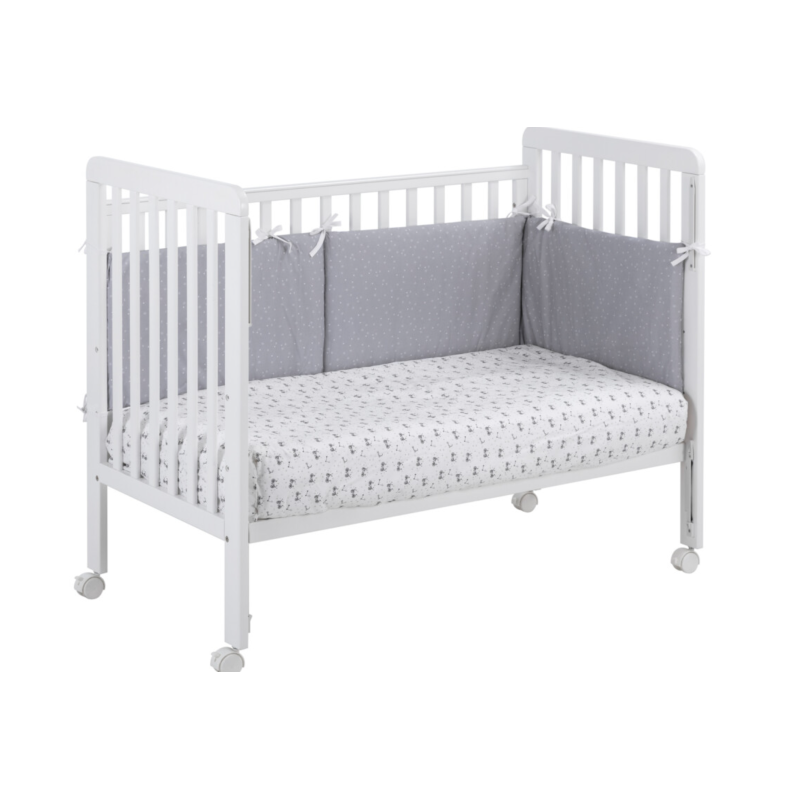 Sus cuatro ruedas con freno aportan gran movilidad y estabilidad, permitiendo desplazarla fácilmente o fijarla en un punto concreto. Además, cuenta con un protector plástico en los barrotes para mayor durabilidad y seguridad, y es compatible con colchón de 60×120 cm (no incluido).