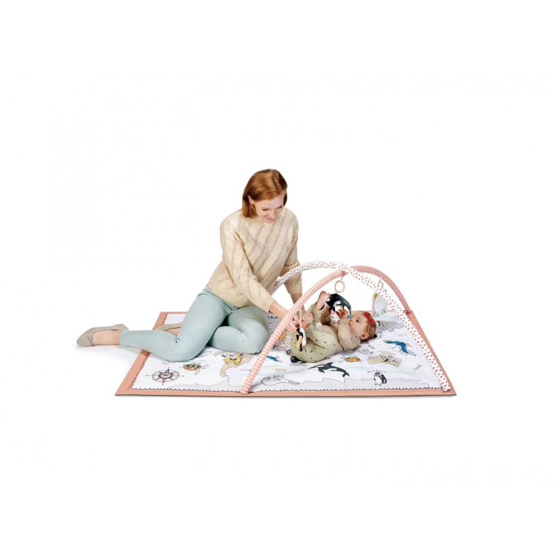 - El conjunto incluye los juguetes: orca de peluche con un mordedor, golondrina con cintas, sonajero con una hoja de peluche, espejo y dos juguetes susurrantes en el tapete.