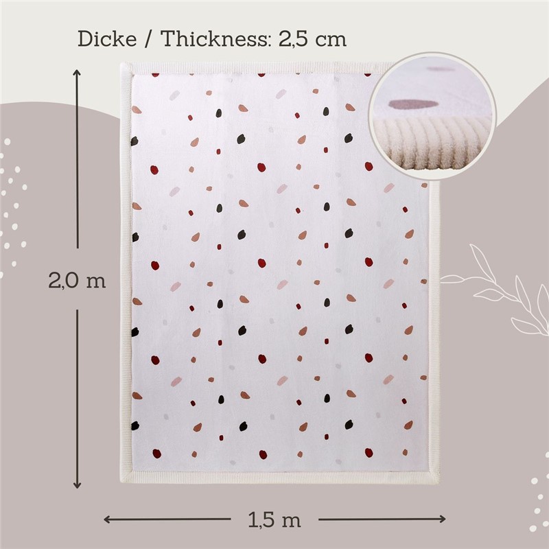Descubre la Alfombra Infantil Nube Confetti, un espacio de juego suave y seguro para tus pequeños. Con unas generosas medidas de 200 x 150 x 2.5 cm, esta alfombra es ideal para gatear, jugar y hacer yoga en casa.