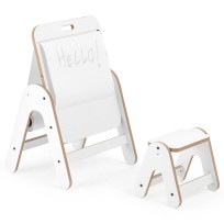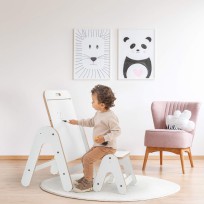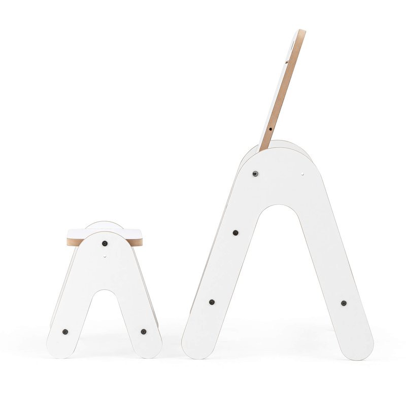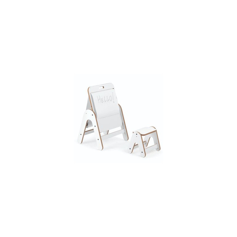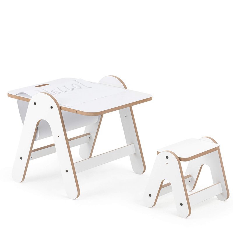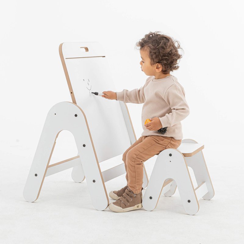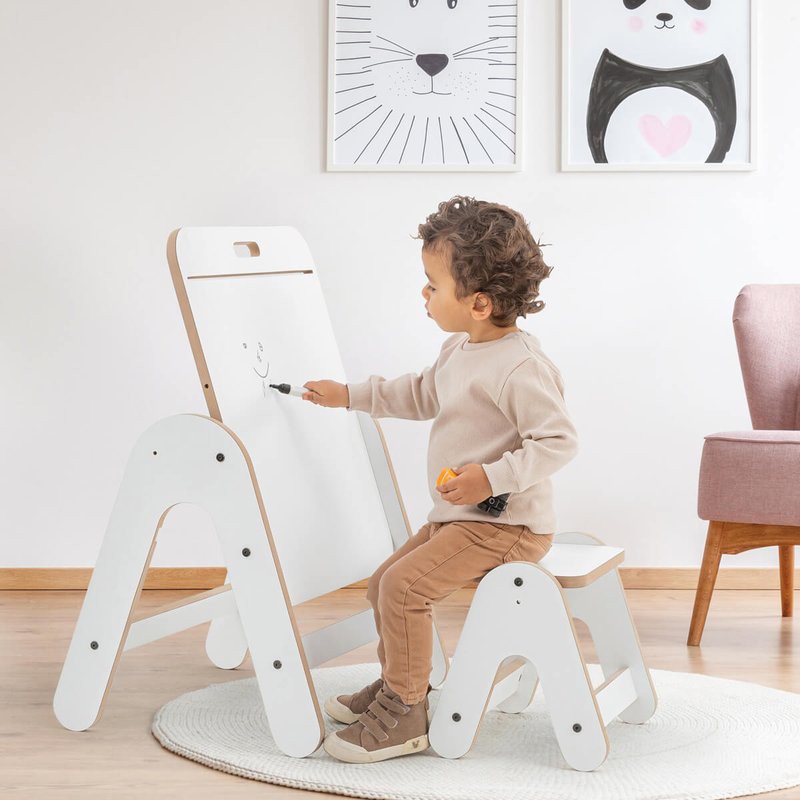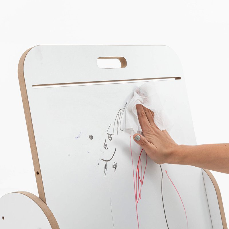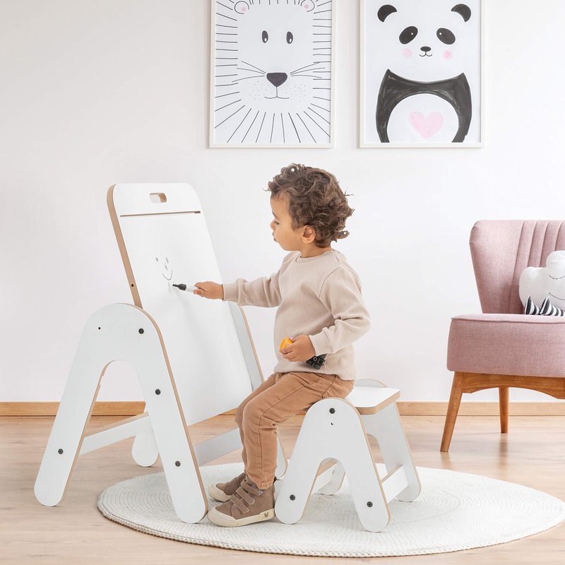 Esta mesa no solo sirve como espacio de juego, sino que también se convierte en una práctica pizarra, perfecta para estimular la creatividad. Los niños pueden escribir o dibujar directamente, y utilizar un rollo de papel (no incluido) que se acopla fácilmente a la barra de madera.