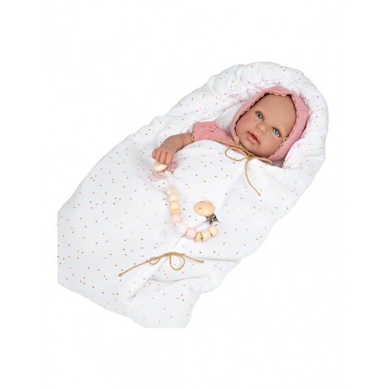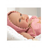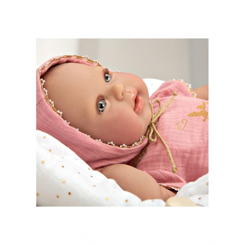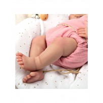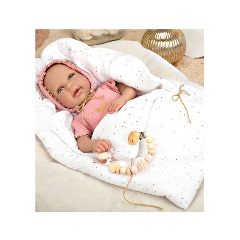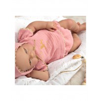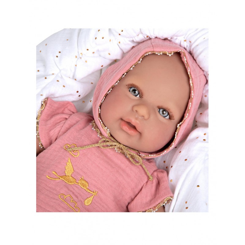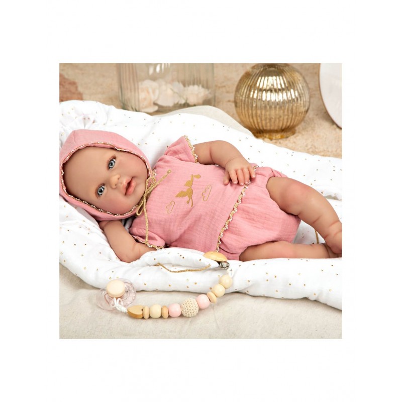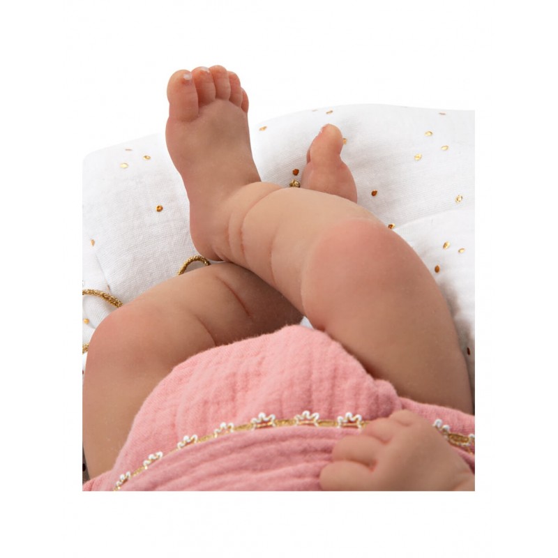 Bebé hiperrealista con cuerpo y extremidades de silicona con ropita en tonos rosados y acabados dorados como el bordado de su camiseta.