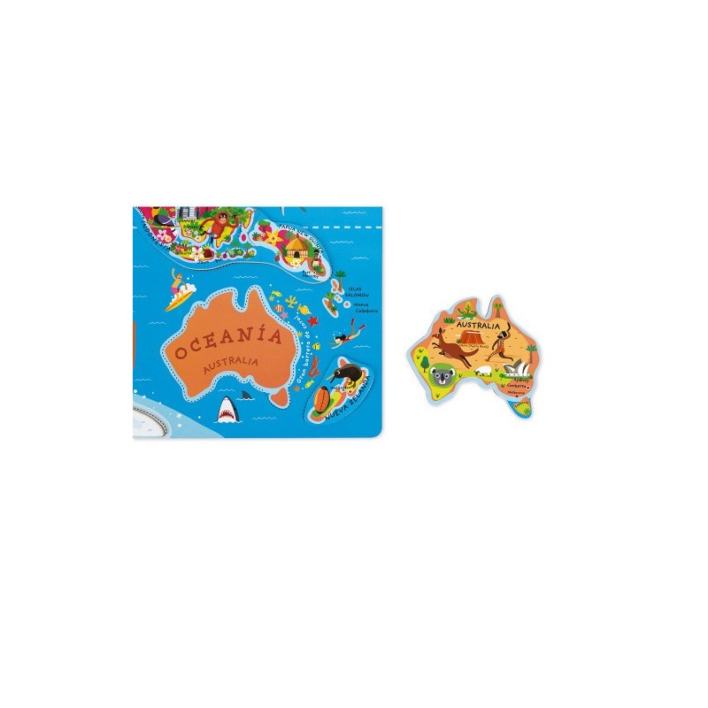 Cada pieza magnética representa un país o una región del mundo, con su correspondiente nombre, capital y una iustración característica de dicha parte del globo
