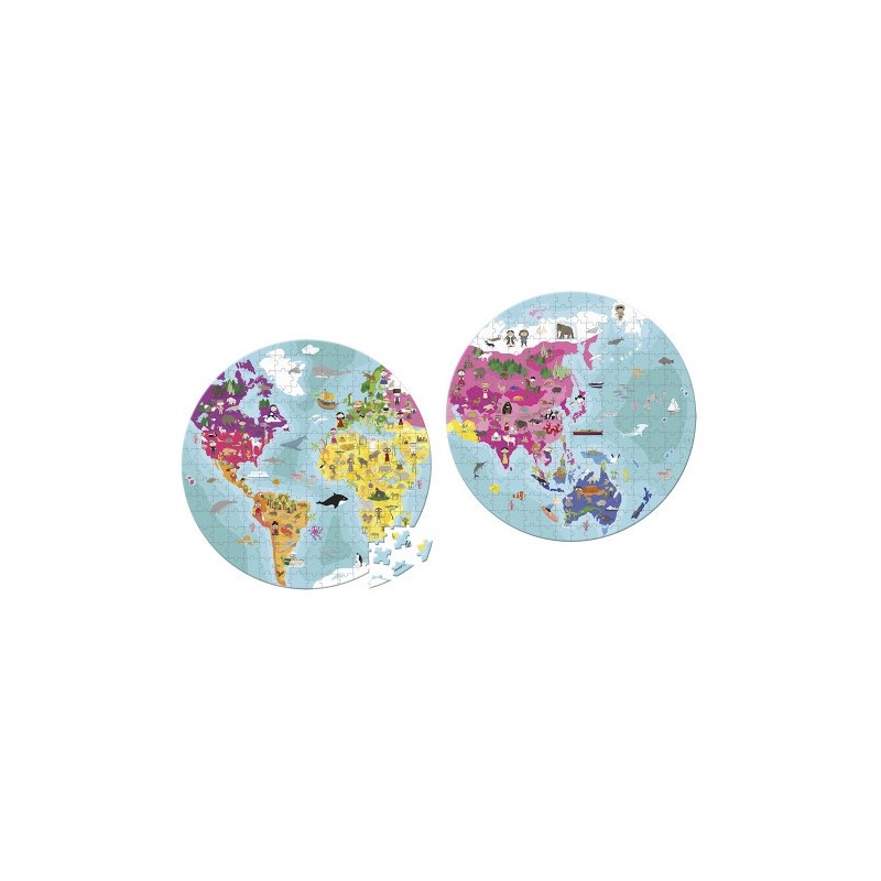 Este puzzle de cartón de Janod con piezas ilustradas a dos caras de la Tierra es ideal para que los peques aprendan las culturas de todos los países y animales típicos de cada continente.