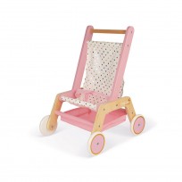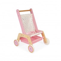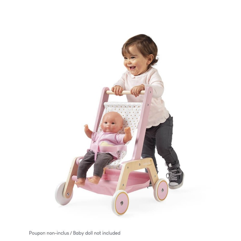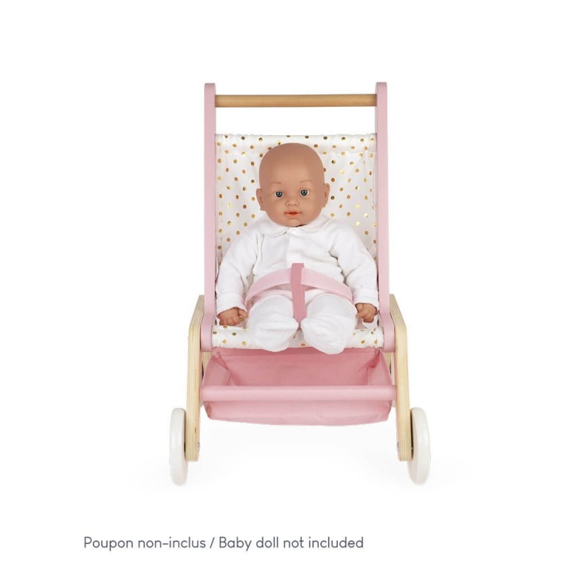 Cochecito de muñecas de madera rosa y dorado de Janod que ayudará a nuestros pequeños a desarrollar el juego simbólico.