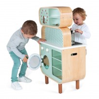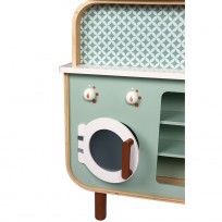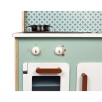Fantástica cocinita Cooker de Janod de colores suaves y estilo moderno, perfectamente equipada, cuenta con un reloj, fregadero de metal, una placa de inducción con luz y sonido, etc.