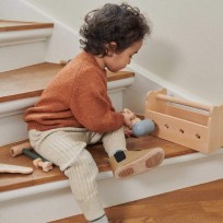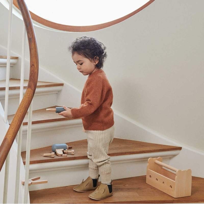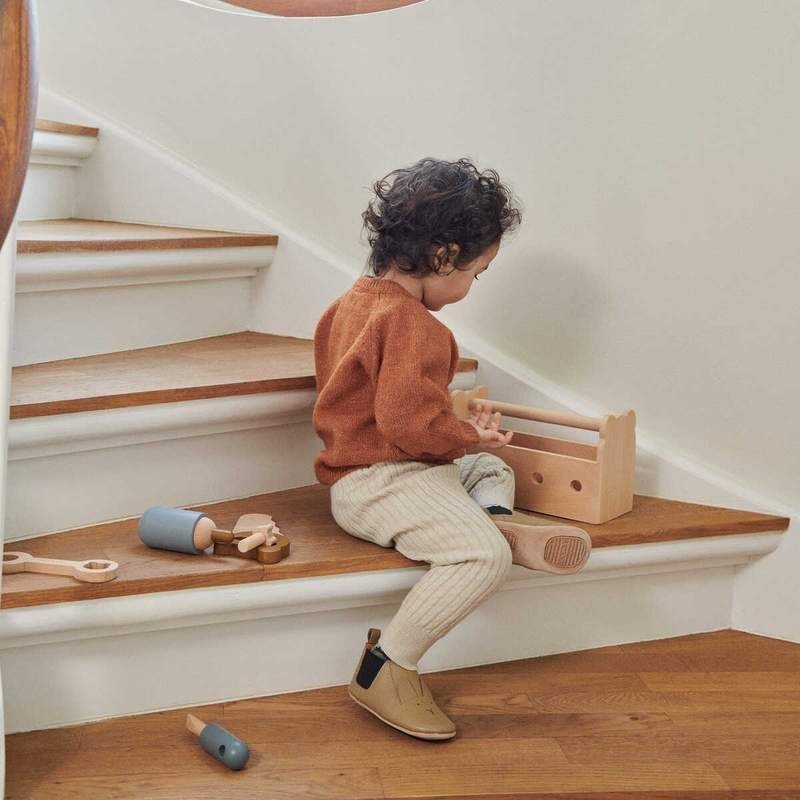 - Tanto la caja como las herramientas vienen fabricadas en madera, pintadas con colores dulces.