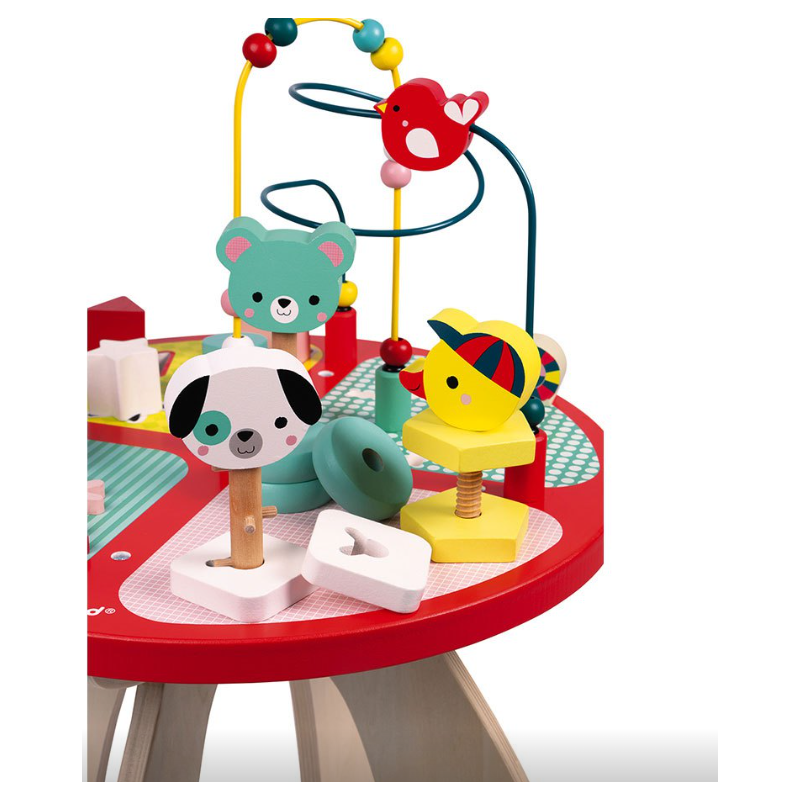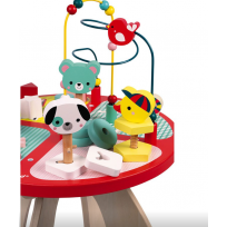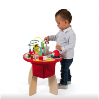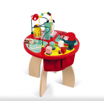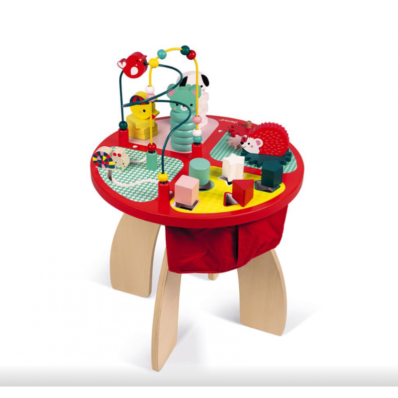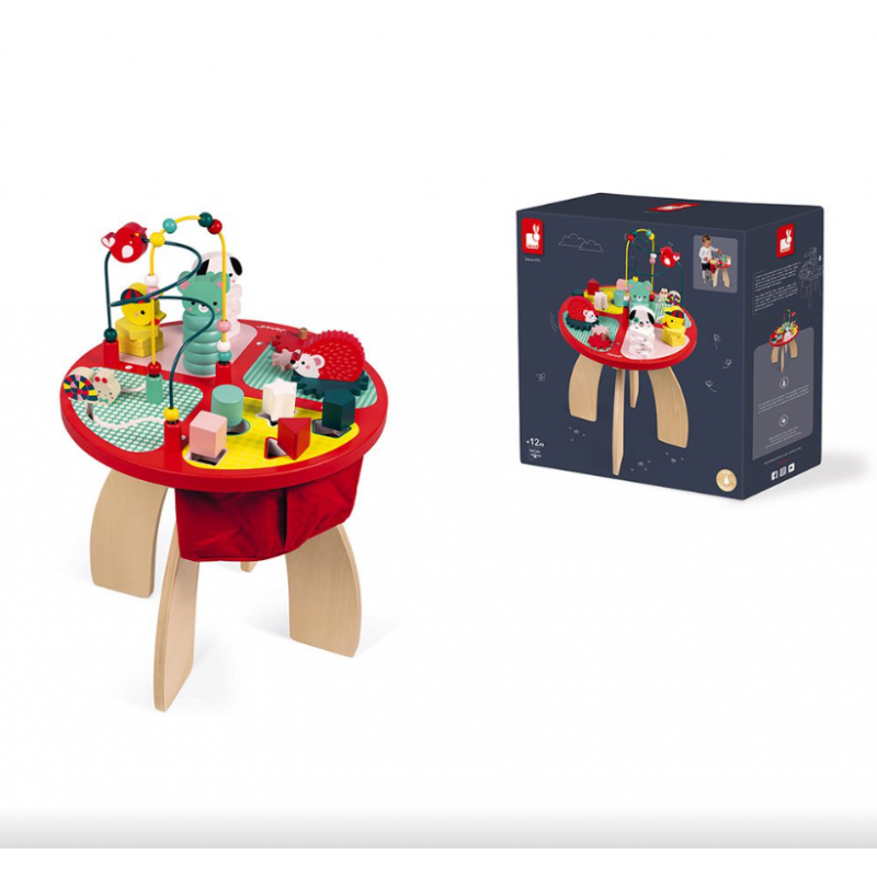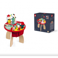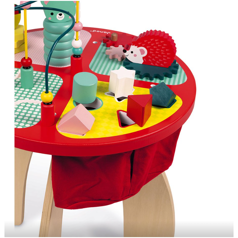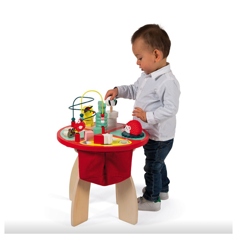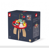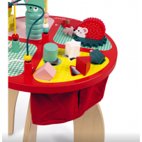 Bonita y divertida mesa de actividades de madera Baby Forest de Janod que contiene diferentes juegos para manipular y encajar, pensados para nuestros nanitos más pequeños.