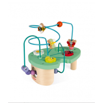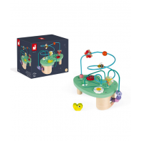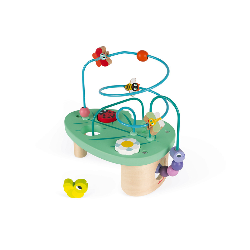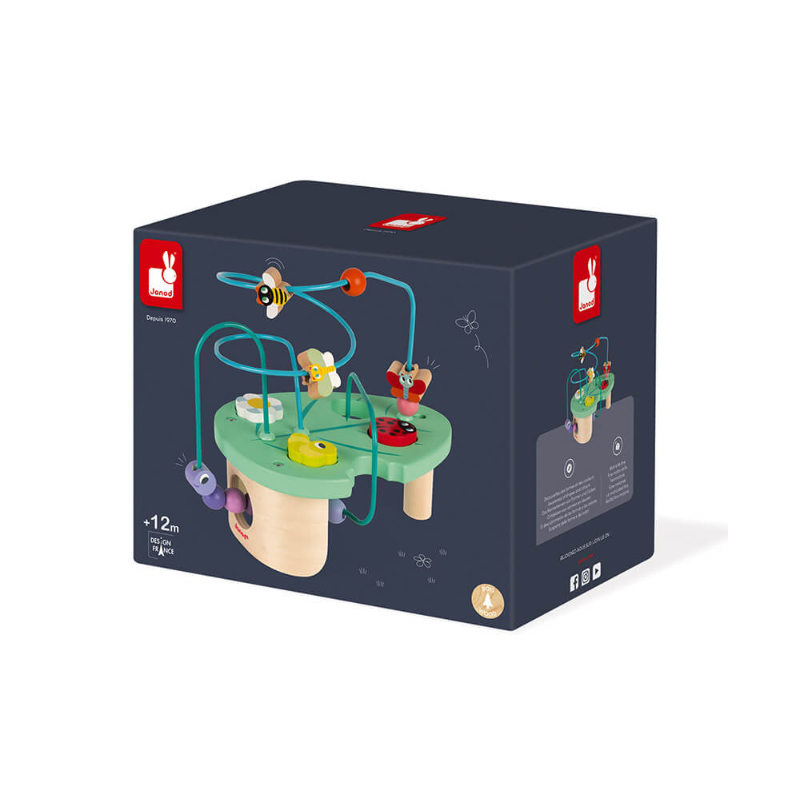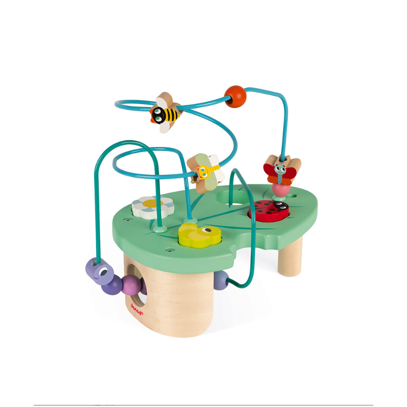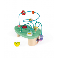 Bonita y divertida mesa de actividades Looping de madera Oruga y compañía de Janod que contiene diferentes elementos para manipular que encantará a nuestros nanitos más pequeños.
