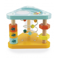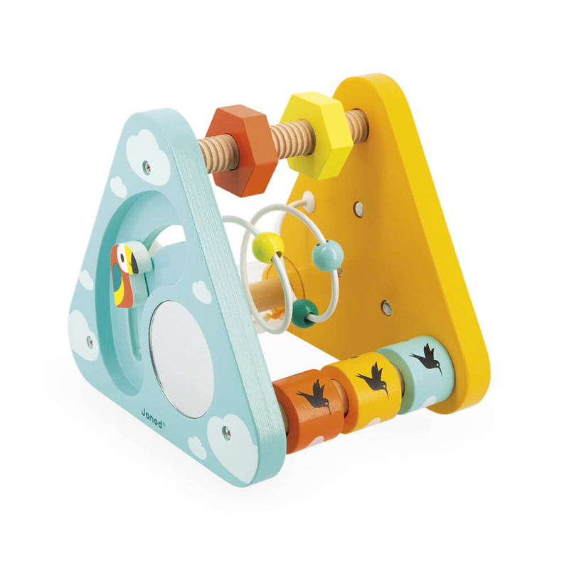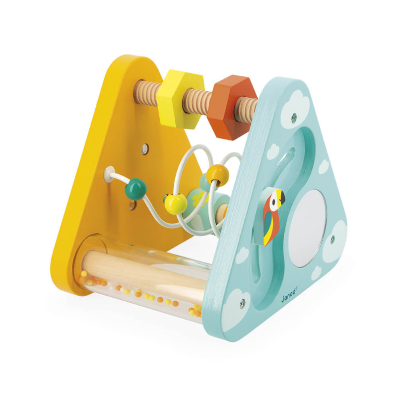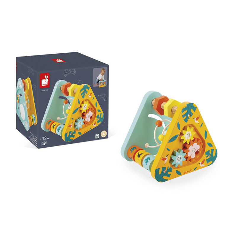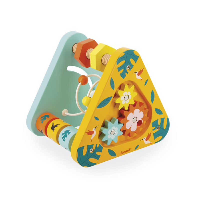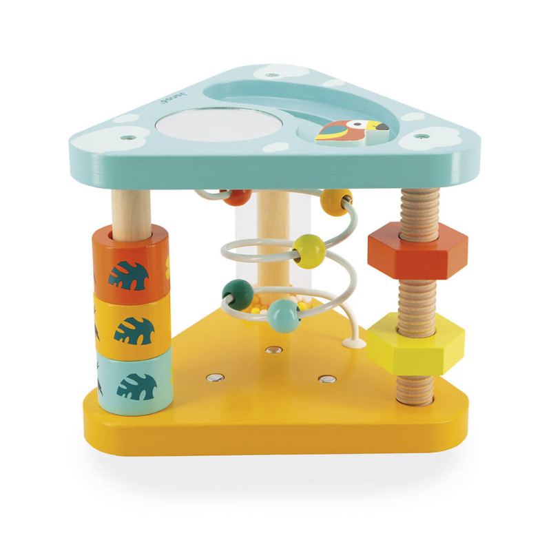 Este triángulo de madera Tropik de Janod contiene diferentes actividades que mantendrán entretenidos a nuestros pequeños.