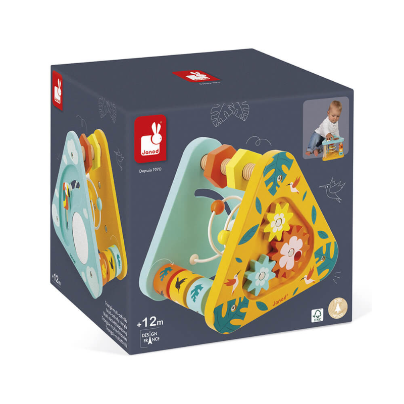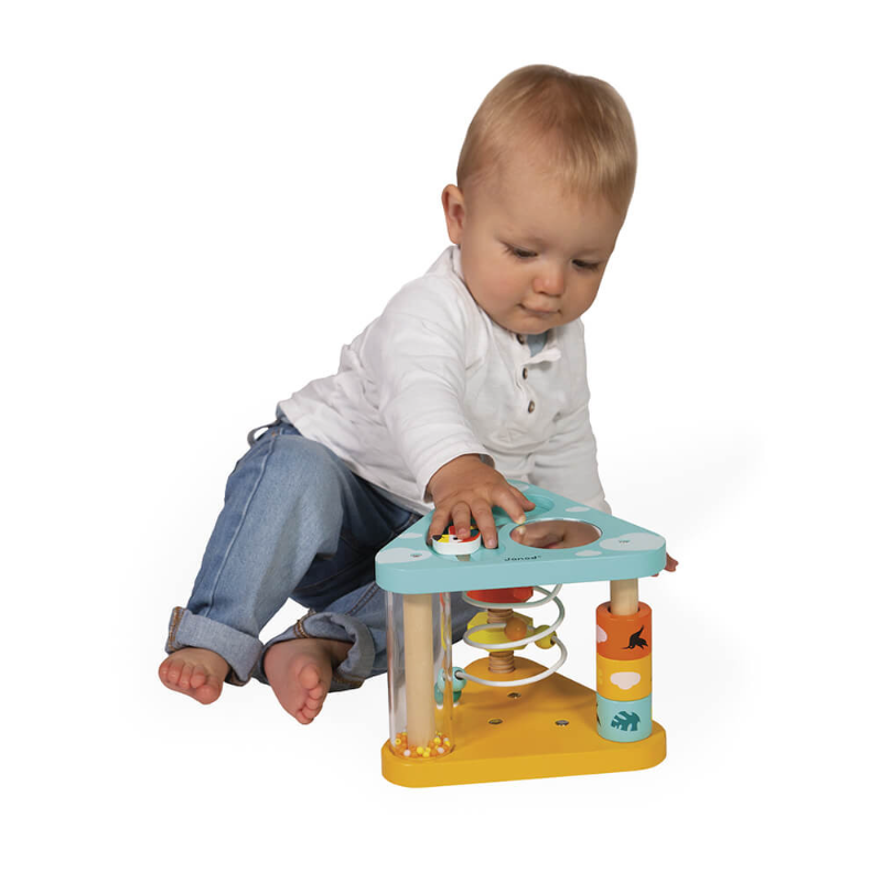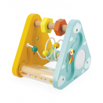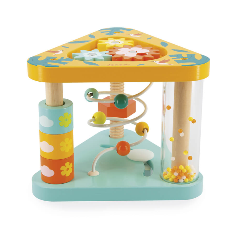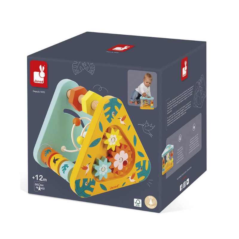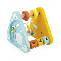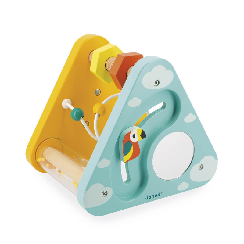 Este triángulo de madera Tropik de Janod contiene diferentes actividades que mantendrán entretenidos a nuestros pequeños.