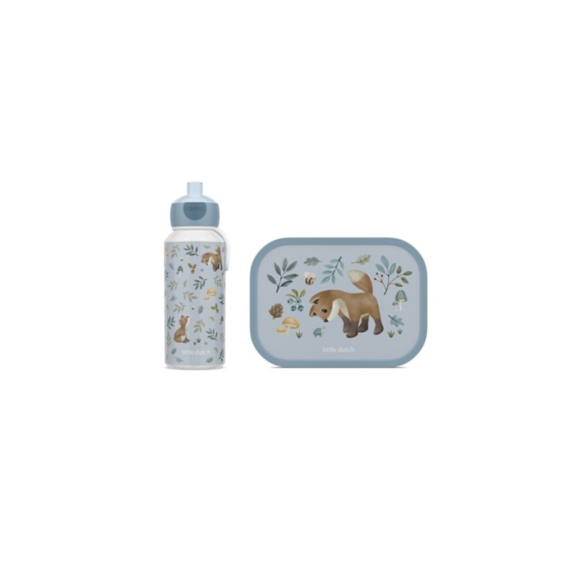 La botella se puede llenar con agua o zumo, la fiambrera se convierte en una caja con separadores y permite un aperitivo variado.