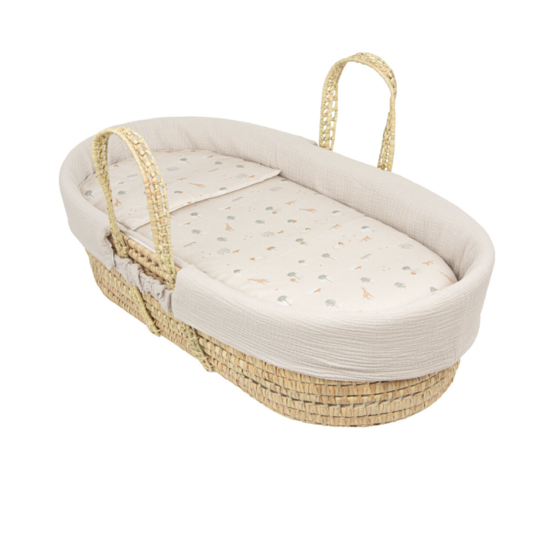 Fabricado con materiales naturales y transpirables, este moisés ofrece un espacio acogedor y seguro que favorece el descanso del recién nacido.