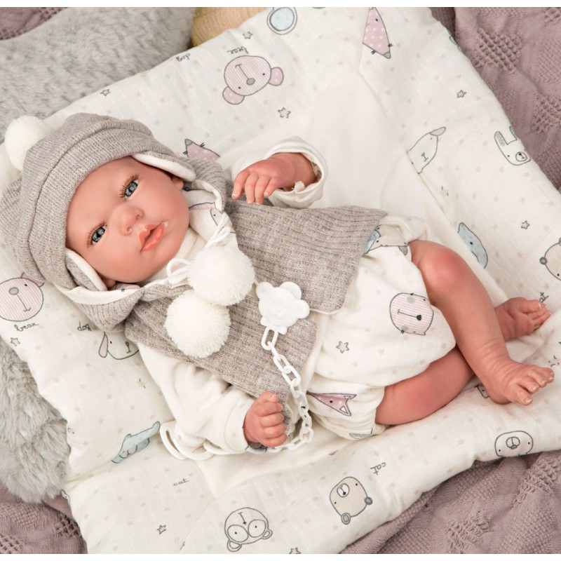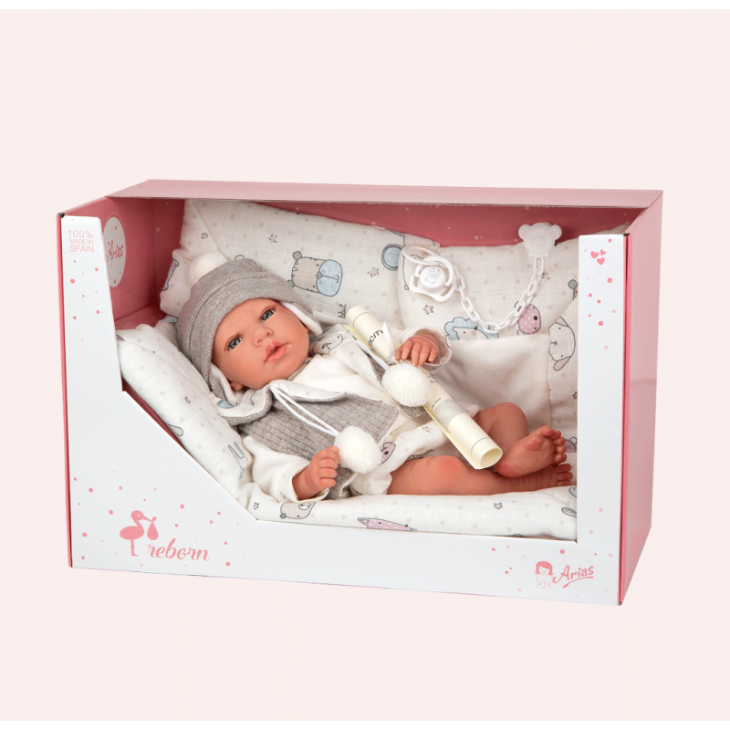 Incluye manta de juegos, chupete, pañal, libro de familia y certificado de autenticidad.