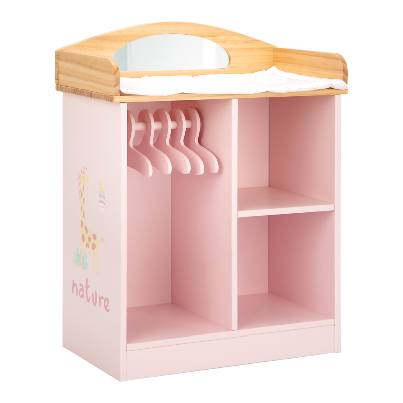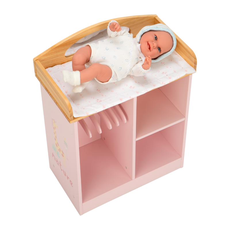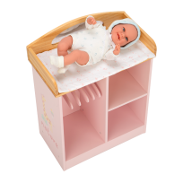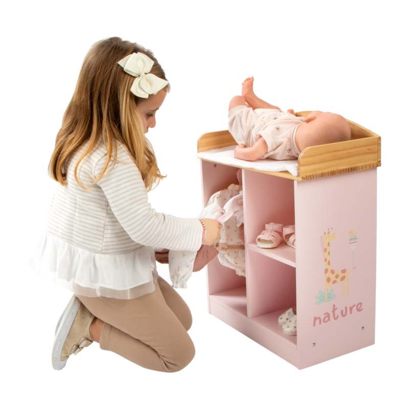En este cambiador de madera en tono rosa, los peques podrán cambiar de ropita a sus muñecas y guardar todos sus complementos.