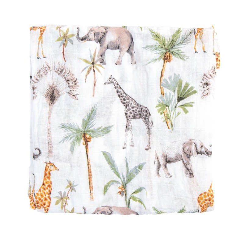 Bonita muselina de bambú confeccionada con el estampado de la colección África de BimbiDreams.