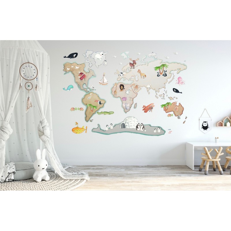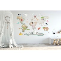 Bonitos y dulces vinilos infantiles que reproducen unos divertidos diseños de dibujos pintados a mano, temática World Map Animals en tamaño XL