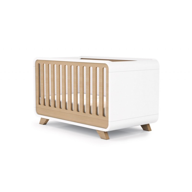 Além de linhas curvas, cores foscas e possibilidade de personalização, ele é criado como um berço conversível, para que você possa usá-lo como cama e mesa quando o bebê crescer.