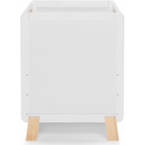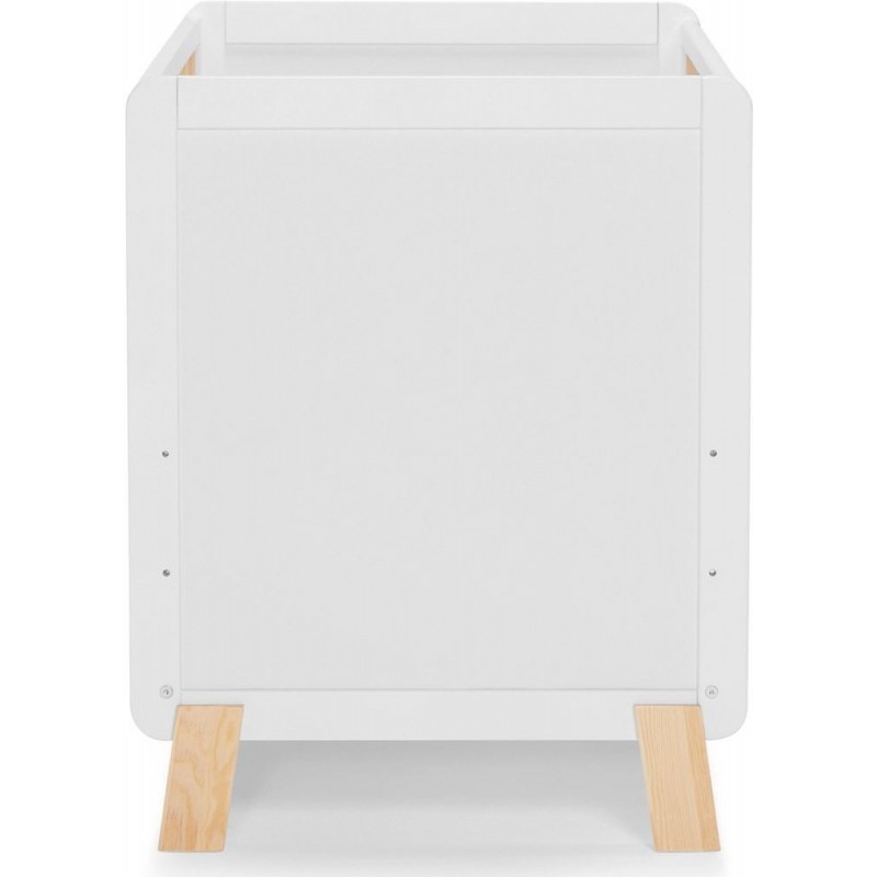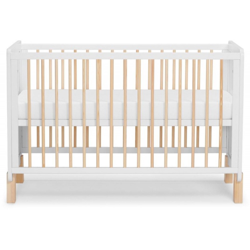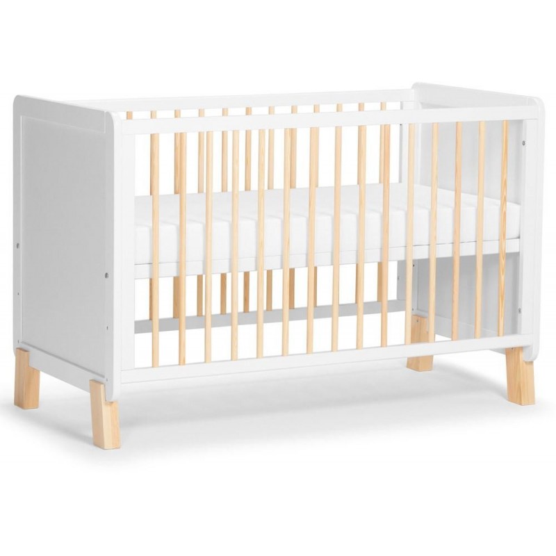 A união das laterais cheias e as laterais construídas em barras dão um toque leve ao berço. As barras são feitas de madeira de pinho natural e pintadas com esmalte transparente e seguro.