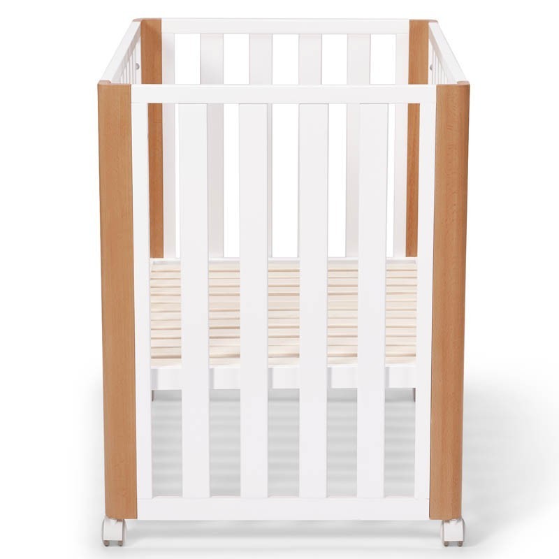 O KOYA está equipado com rodas: para deslocar o berço, basta soltar o bloqueio. Graças ao piso de PU, eles não arranham o solo.