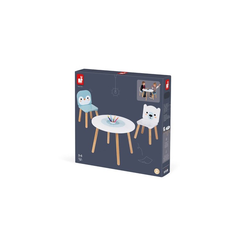 Linda mesa posta com duas cadeiras da Janod para que os mais pequenos da casa tenham seu canto especial de atividades e que possam compartilhá-lo com os amigos.