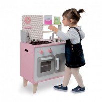 A cozinha de madeira Janod Macaron tem um ar muito romântico em seus tons de rosa
