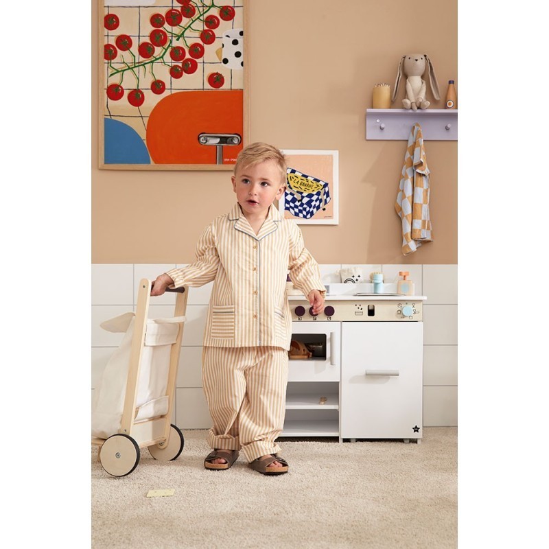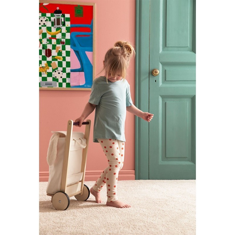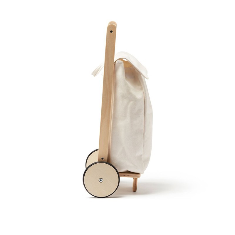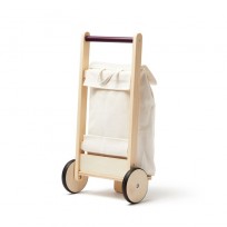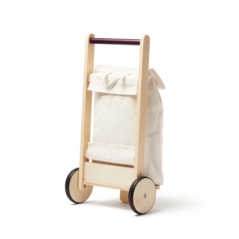 Eles poderão fazer compras em casa ou ir ao supermercado com a mamãe e o papai, pois as rodas de madeira contêm uma borracha que lhes permitirá arrastar o carrinho com eles.