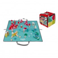 Múltiplas possibilidades para arquitetos iniciantes: cidades, torres, paisagens. A criança poderá brincar num tapete decorativo para brincar (75 x 75 cm), 2 em 1, que também serve para arrumação e transporte.