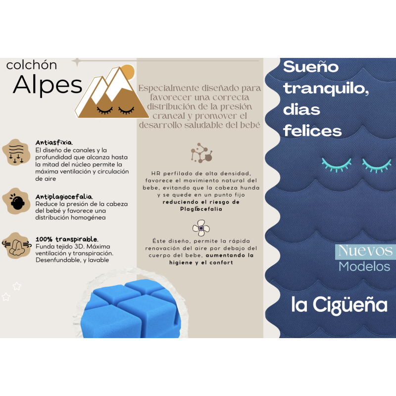 O colchão Alpes foi desenvolvido para proporcionar um descanso seguro, confortável e altamente ventilado, favorecendo uma distribuição uniforme da pressão craniana e reduzindo os riscos de plagiocefalia nos primeiros meses de vida do bebê.