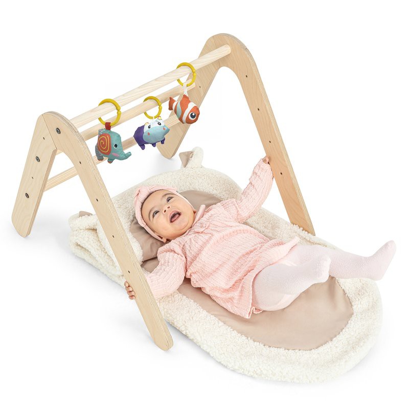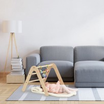 Descubre el Gimy gimnasio Montessori para bebé, un producto diseñado para fomentar la estimulación, confort y autonomía desde el primer día de vida. Este encantador gimnasio no solo es un espacio de juego, sino un aliado en el desarrollo del pequeño. Con su estructura triangular de madera y tres barras robustas, permite colgar juguetes y cintas, creando un universo sensorial lleno de texturas y sonidos.