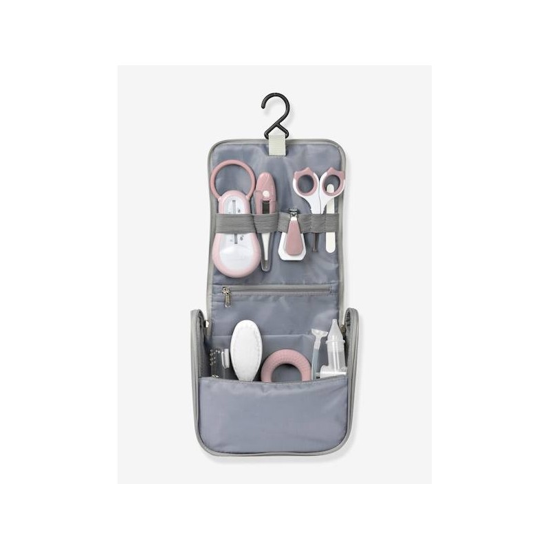 - Contém 9 acessórios: Termômetro de banho, termômetro digital, cortador de unhas, escova de cabelo, mordedor, massageador de gengiva, lixa de unha, aspirador nasal.