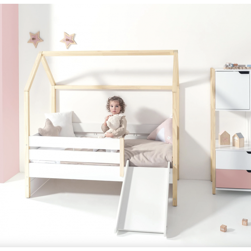 A cama Montessorian a tem uma base com opção de 2 alturas para dormir ao nível do chão ou mais alto. Com a base de ripas elevada, a cama casinha infantil tem como acessório,