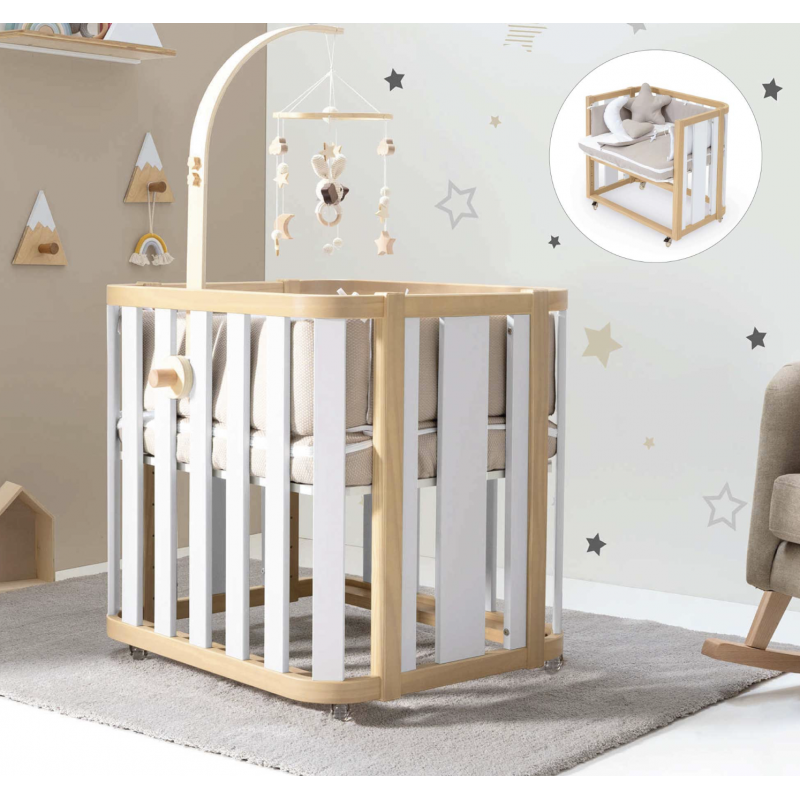 Este mini berço permite dormir junto com o kit opcional em segurança. Inclui também rodas com travões para o mover confortavelmente onde for necessário.