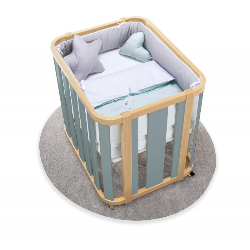 Este mini berço permite dormir junto com o kit opcional em segurança. Inclui também rodas com travões para o mover confortavelmente onde for necessário.