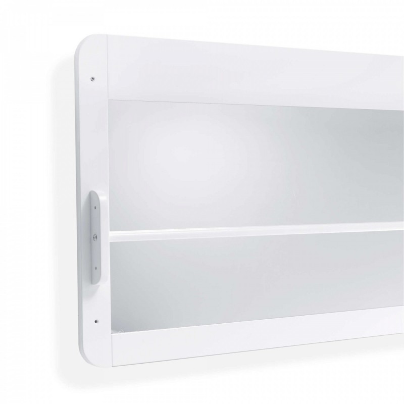 1ª etapa - etapa infantil. Fixando o espelho horizontalmente. Inclui dois suportes laterais e uma barra central, para que o bebê possa se segurar e se refletir no espelho. Esta barra pode ser posicionada em três alturas diferentes para se adaptar ao crescimento do bebê. A parte superior da moldura do espelho é mais larga do que as demais para poder adicionar detalhes com vinil, como o nome do bebê.