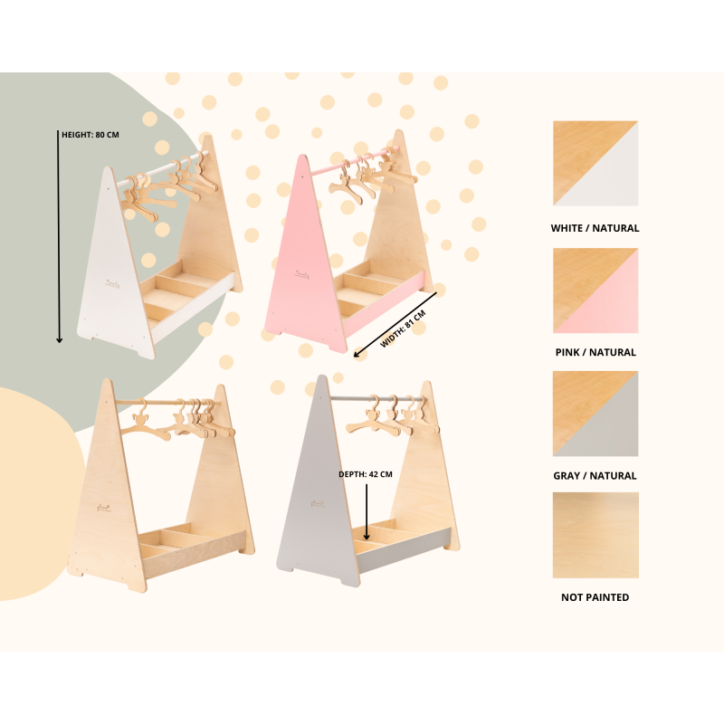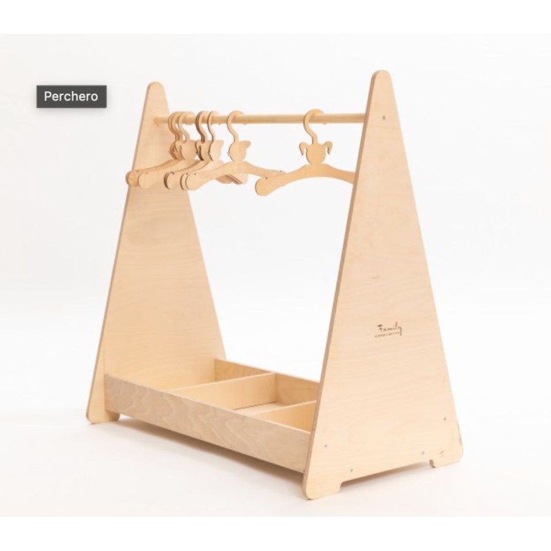 O cabideiro infantil Montessori para roupa é um móvel funcional inspirado na filosofia Montessori e Waldorf, criado para estimular a independência infantil no dia a dia. Graças à sua estrutura aberta e altura adaptada às crianças, facilita o acesso às peças sem necessidade de ajuda, desenvolvendo responsabilidade e confiança.