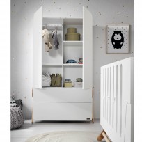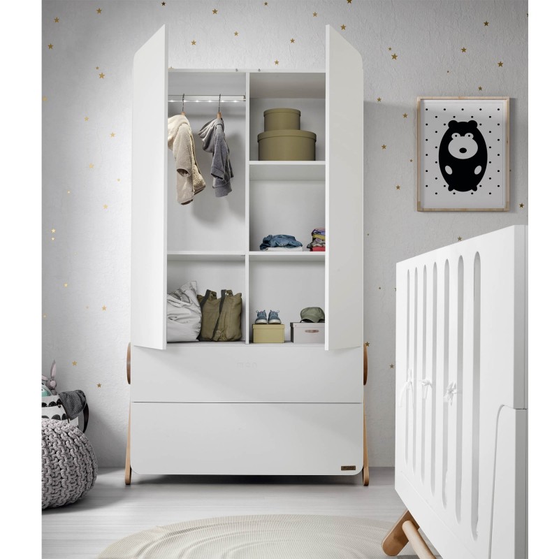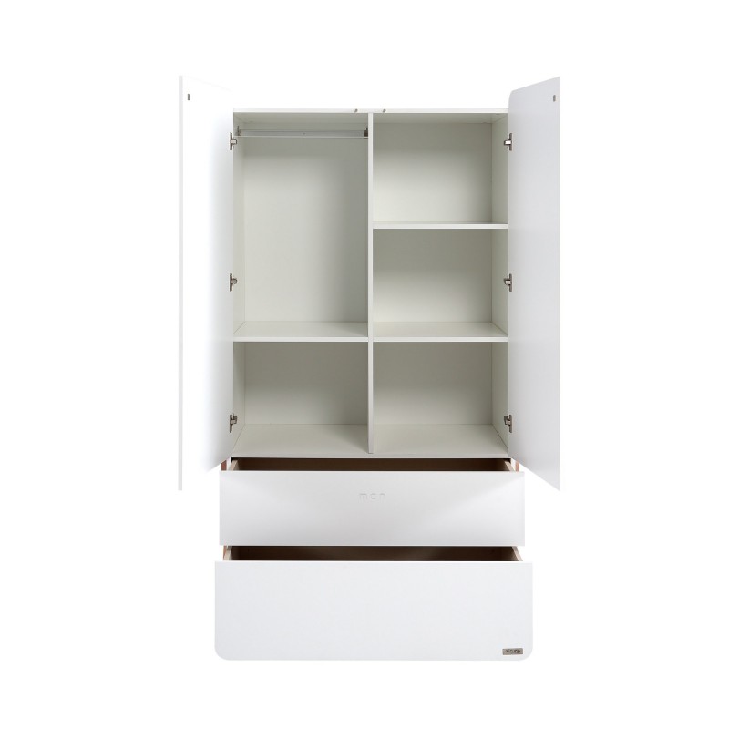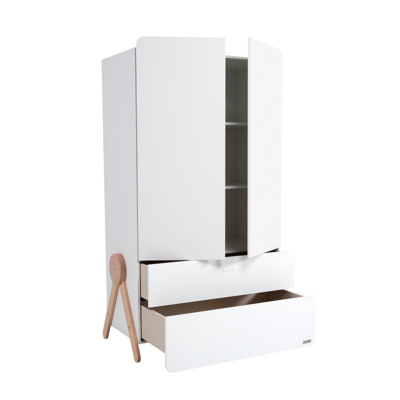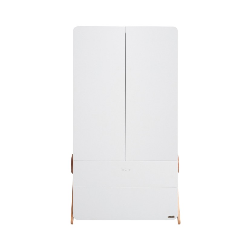 Nosso guarda-roupa é feito de madeira de faia lacada branca, com tintas à base de água e vernizes não tóxicos.