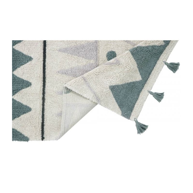Um destaque do mini tapete asteca são os acabamentos em corda com borlas em azul antigo.