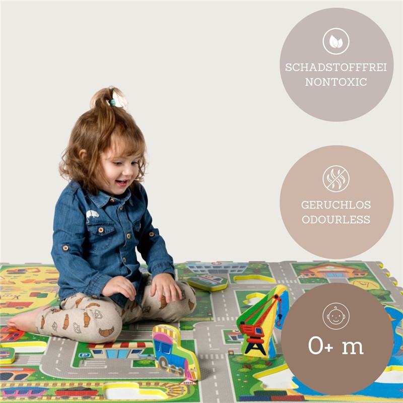 La alfombra de juego Ciudad es el complemento ideal para el entretenimiento infantil. Con 16 alfombras de espuma entrelazables, incluye carreteras de 6 cm, edificios como estadios y hospitales, y 11 formas de automóviles extraíbles. Su diseño permite un juego seguro y divertido.