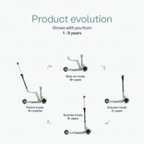 Esta scooter transforma-se de um veículo para utilização no campo numa scooter independente para crianças e, mais tarde, numa scooter com uma base e guia extensos para crianças.